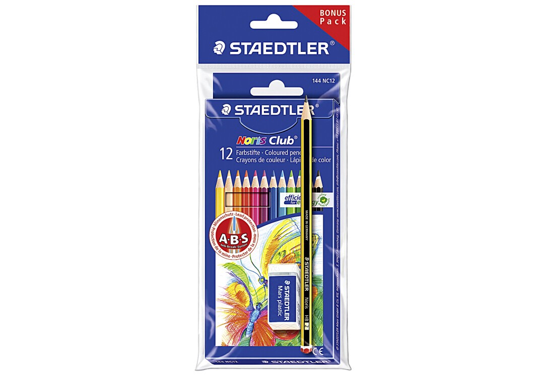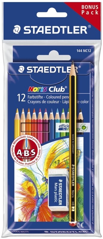 Set mit 12 sortierten Farben, 1 Noris Bleistift und zusätzlich 1 Mars plastic mini Radierer