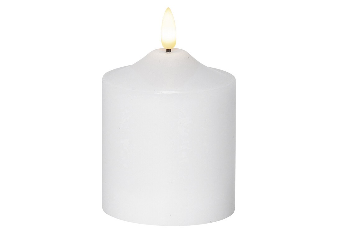 LED-Kerze "Flamme", Wachskerze, mit einer natürlich aussehenden Flamme, warm-weiß, eingebauter Timer, 0,03 W, 3 V DC, Batterie 2 x AA (nicht enthalten), IP 20, Maße: (LxBxH): 7,5x7,5x12 cm.