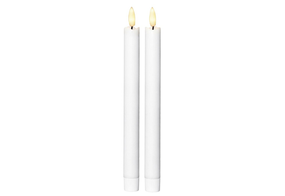 LED-Leuchterkerze "Flamme" 2er Set Wachskerze, mit einer natürlich aussehenden Flamme, warm-weiß, eingebauter Timer, 0,03 W, 3 V DC, Batterie 2 x AA (nicht enthalten), IP 20, Maße: (LxBxH): 2,1x2,1x25 cm.