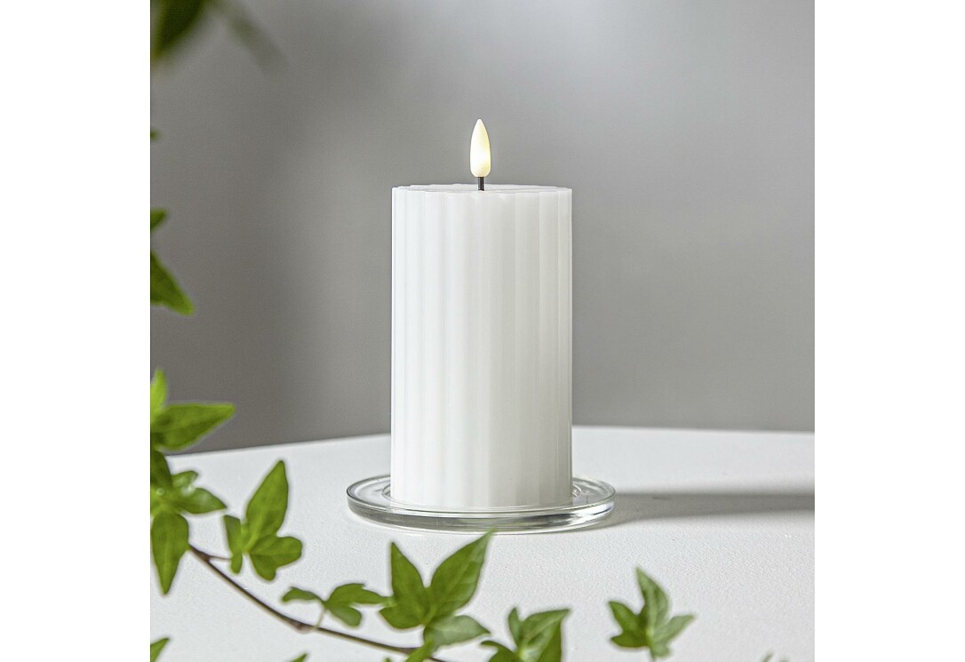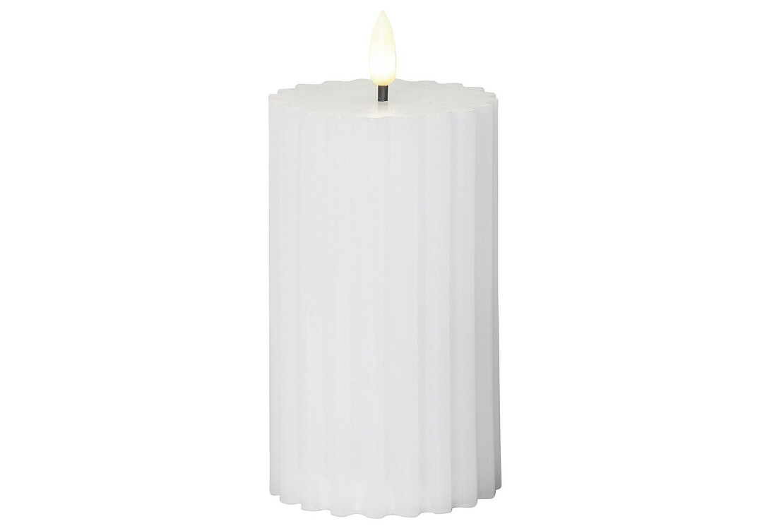 LED-Wachskerze "Flamme Stripe" 7,5x15 cm, natürliche Flamme, ww LED, weiß, Kunststoff/Wachs, Batterie (im Lieferumfang nicht enthalten), Timer, Vierfarb-Karton