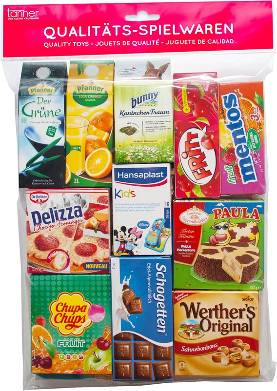 Gefüllt mit zahlreichen Lebensmittelverpackungen. Die optimale Ergänzung für jeden Kaufladen. 15 Teile. Leerverpackungen. Ab 3 Jahren.