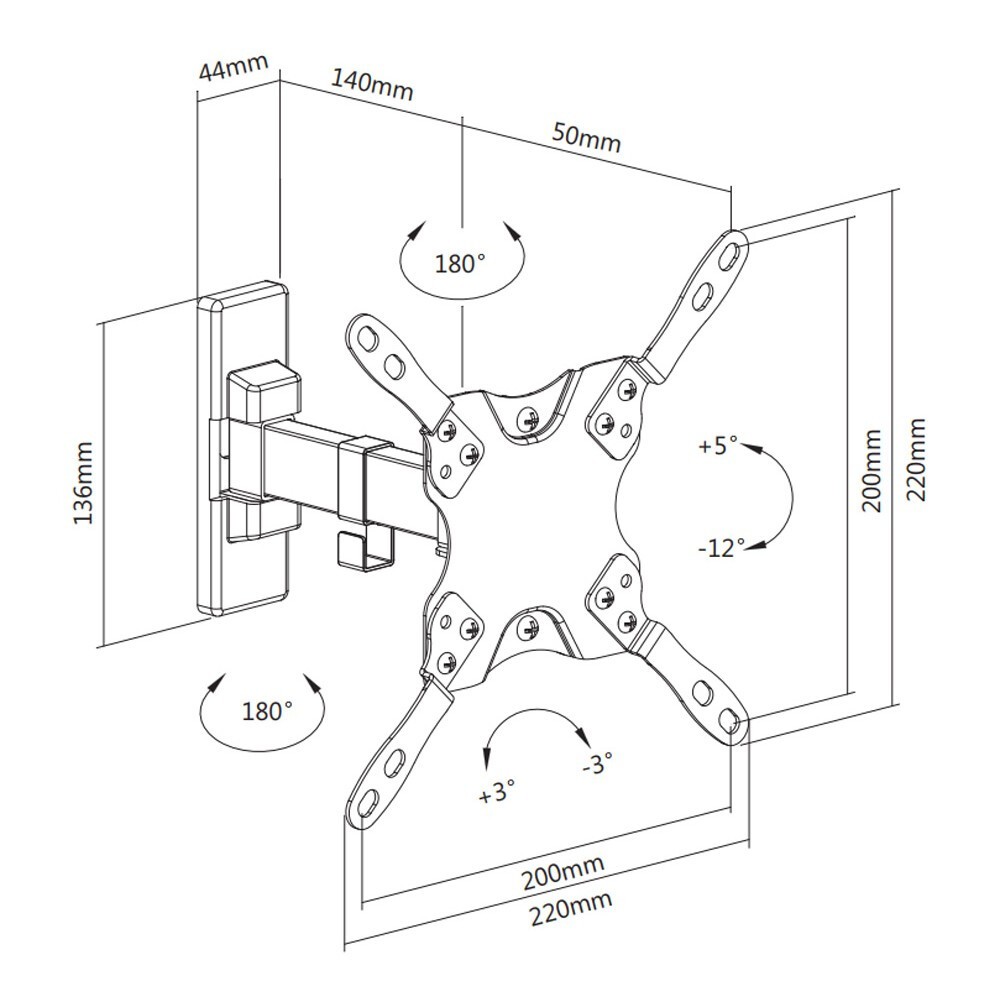 Techly ICA-PLB-400STY. Maximum weight capacity: 20 kg, Minimum screen size: 33 cm (13"), Maximum screen size: 106.7 cm (42"), Minimum VESA mount: 75 x 75 mm, Maximum VESA mount: 200 x 200 mm. Tilt angle range: -5 - 12°, Angle of rotation: 180°, Distance to the wall (min): 6 cm, Distance to the wall (max): 19 cm. Product colour: Black