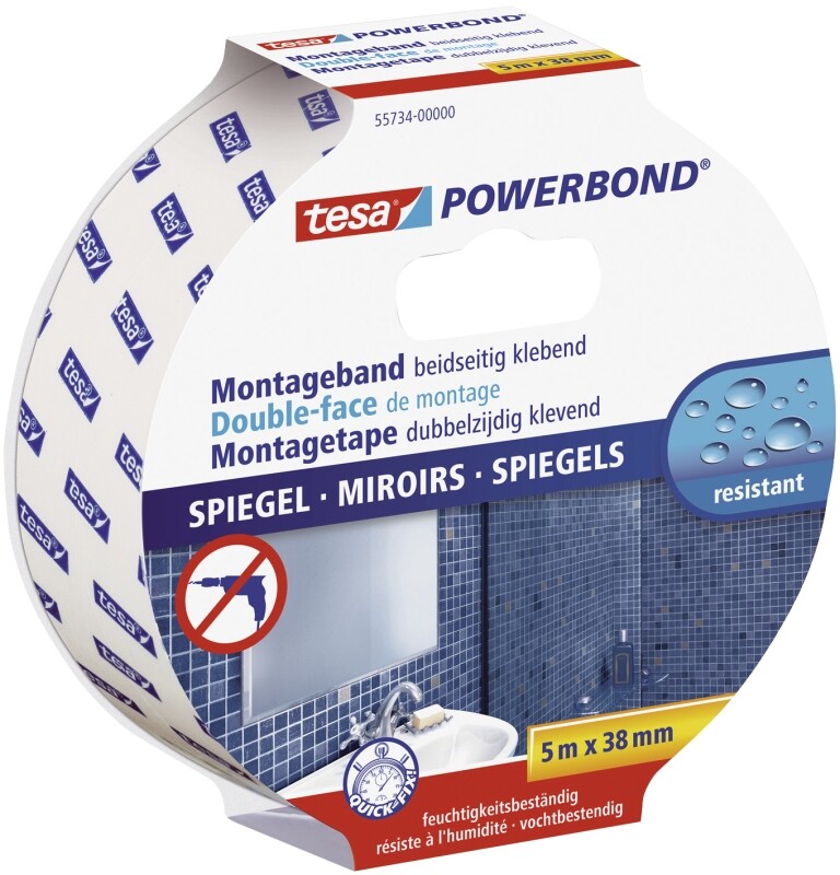 tesa® Powerbond® MIRROR is a double-sided self-adhesive tape that offers superior bonding power, even in humid surroundings such as bathrooms. It can hold mirrors of up to 70x70 cm with a thickness of up to 4 mm. You can forget about the mess and hassle of nails or screws. This specially developed tape will securely attach your bathroom or wall mirrors without damaging any underlying tiles.