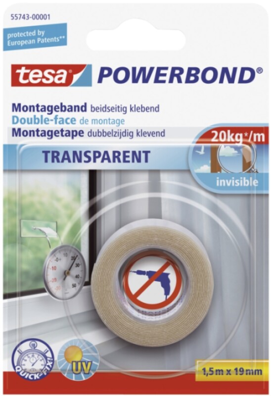 Tesa Powerbond TRANSPARENT - Mounting tape - Transparent - 1.5 m - Indoor - Glass,Plastic - 0.2 kg/cm