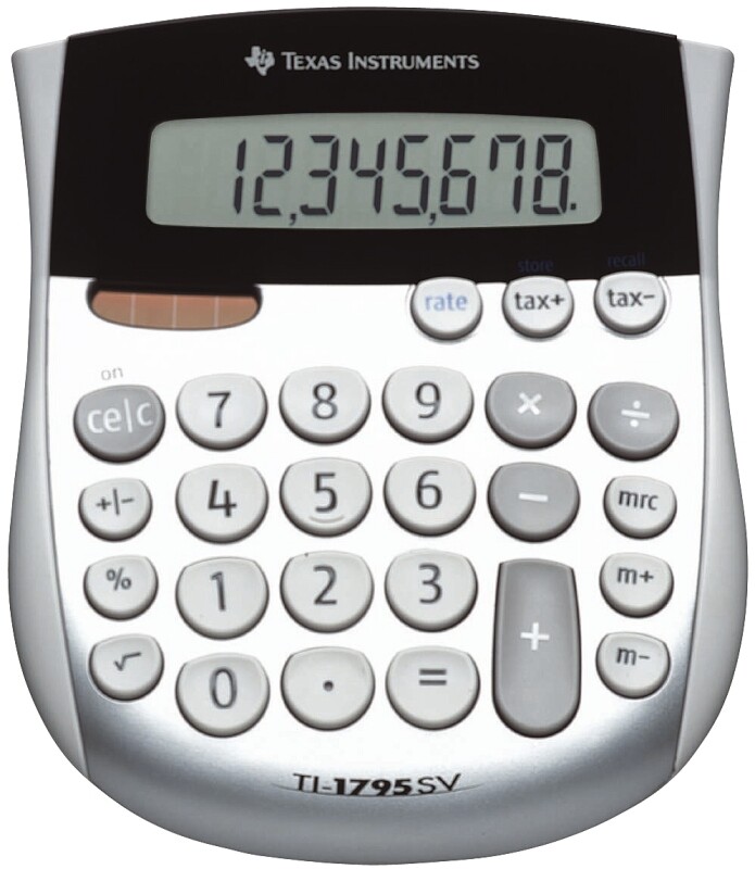 Texas Instruments TI-1795 SV. Form factor: Desktop, Type: Basic. Digits: 8 digits, Display number of lines: 1 lines, Display tilting. Tax calculation. Power source: Battery/Solar. Product colour: Black,Silver,White