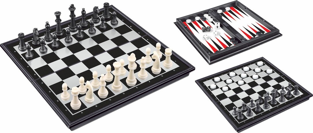 Classic Games 3 in 1 Magnetspiel. Für Dame, Schach und Backgammon. Ideal auch für unterwegs. Maße ca. 32x32x2 cm. Für Kinder ab 8 Jahren.