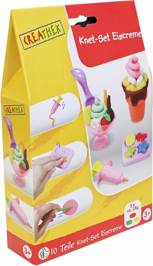 Creathek Knet-Set Eiscreme, 10 Teile. Bestehend aus drei Knetpackungen mit jeweils 38 Gramm Knete in den Farben grün, gelb und rosa. Außerdem zwei Eisbecher, zwei Formen, ein Löffel, eine Spritze und ein Modellierwerkzeug. Für Kinder ab 3 Jahren.