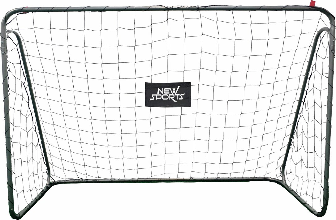 New Sports Fußballtor mit einem schwarzen 5-lagigem Tornetz und einer Maschenweite von ca. 10 cm. Alle Rohre haben eine silberne Pulverbeschichtung. Das Hauptrohr hat einen Durchmesser von ca. 25x0,6 mm und das Stützrohr von ca. 22x0,6mm. Aufbaumaße ca. 180x120x60 cm