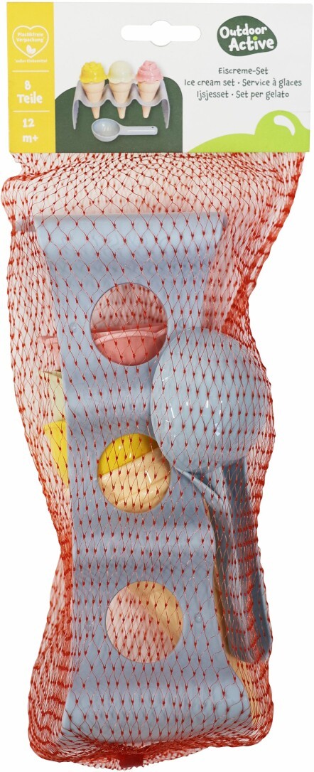 Outdoor active Eiscreme-Set, 8-teilig, aus hochwertigem Kunststoff. Das Set beinhaltet drei Eisförmchen in verschiedenen Farben, ein Eisständer und einen Sandlöffel. Maße ca. 32x8,8x9,5 cm. Für Kinder ab 12 Monaten.