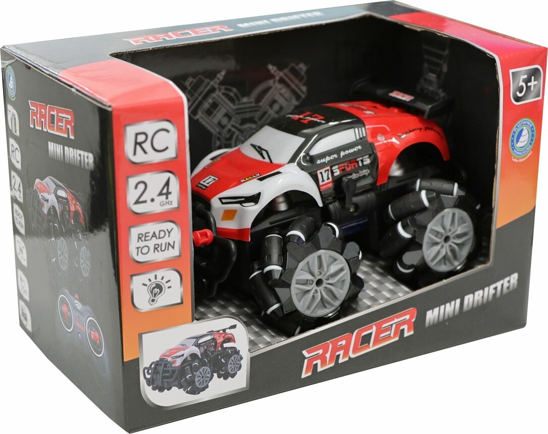 Der Racer R/C Mini Drifter macht einfach Spaß. Ob Vorwärts, Rückwärts, Links, Rechts, kann er auch zur Seite wegdriften. Mit LED Lichter. Control Distanz ca. 25 Meter. Geschwindigkeit ca. 8-10 km/h Mit 2.4GHz. Maße ca. 14,5x10,5x8,5 cm. Inklusive AA 1,5V Batterien. Für Kinder ab 5 Jahren.