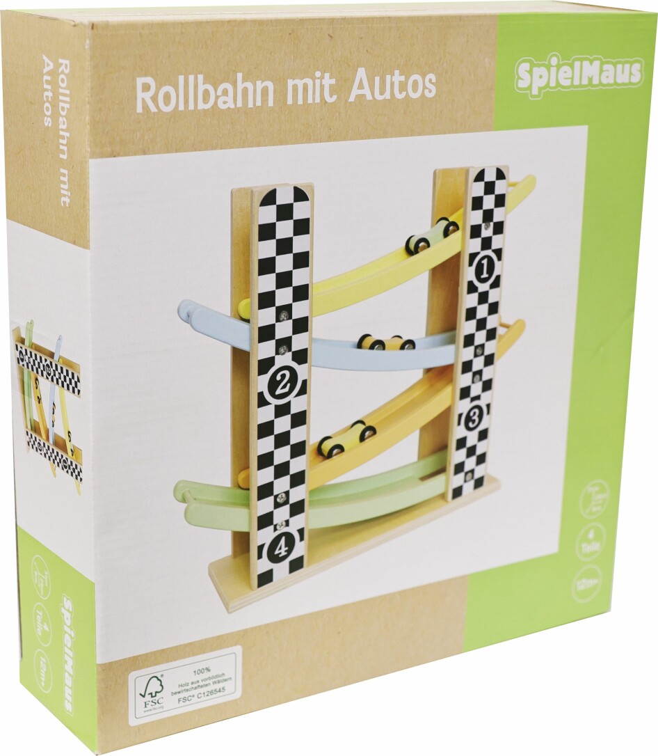 SpielMaus Holz Rollbahn inklusive 3 Autos die man auf 4 Etagen fahren lassen kann. Maße ca. 8x31,5x28,5 cm. Für Kinder am 12 Monaten.