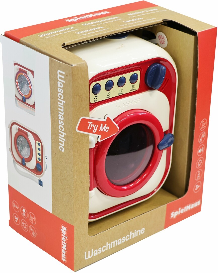 SpielMaus Küche Waschmaschine mit Licht und Sound. Sie wäscht und schleudert wie eine richtige Waschmaschine. Das Wasser wird aus dem angeschlossenem Schlauch heraustransportiert. Maße ca. 21,5x10,5x23,0cm. Inklusive 3xAA Batterien. Für Kinder ab 3 Jahren.