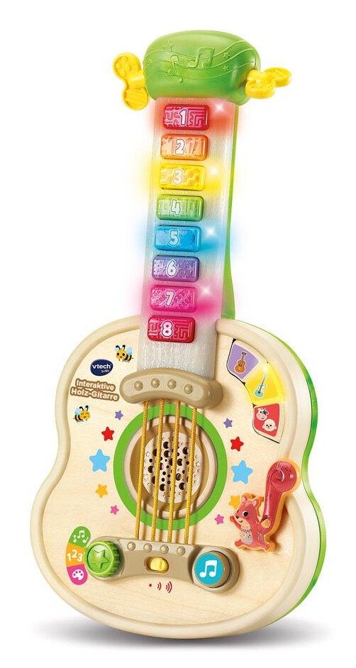 Kleines Kind, großer Rockstar! Mit der elektronischen Gitarre aus Holz kann nicht nur eigene Musik kreiert, sondern auch eine magische Lichtershow betrachtet werden. 3 Spielmodi, die per Modusschalter gewählt werden können: Formen, kreatives Spiel und Lichtershow. 8 bunte und aufleuchtende Tasten, die als Musiknoten dienen. 3 aufleuchtende Gitarrentasten zum Ändern der musikalischen Soundeffekte (Akkustik, Electro und Bass). 4 Gitarrensaiten. Die verschiedenen Tasten und Saiten lösen je nach Modus verschiedene Antworten zu Formen, Farben, Zahlen sowie Melodien und Lieder aus. 4 gesungene Lieder und zahlreiche vorinstallierte Melodien. Kindersicheres Batteriefach und Lautstärkeregler