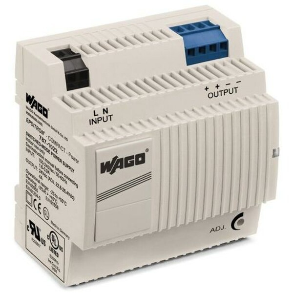 Wago 787-1022. Total power: 96 W, AC input voltage: 85 - 264 V, AC input frequency: 44 - 66 Hz. Mean time between failures (MTBF): 500000 h, Certification: EN 60950-1; EN 61204-3; UL 60950-1; UL 508; DNV GL, Country of origin: Germany. Product colour: Gray, Cooling type: Passive. Width: 90 mm, Depth: 59 mm, Height: 89 mm