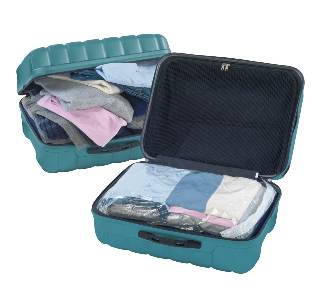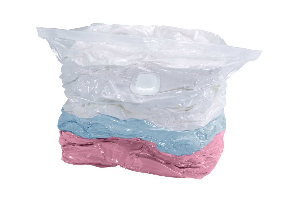 Mit dem praktischen WENKO Vakuum Aufbewahrungssystem lösen sich alle Platzprobleme im Handumdrehen. Einfach die Kleidungsstücke in den Vakuum Cube L Beutel geben, verschließen und mit Hilfe des Staubsaugers die Luft durch das Blitz-Ventil absaugen. Spielend leicht wird so bis zu 75% Platz gespart. Der Vakuum-Beutel mit der Größe L (70 x 100 x 35 cm) ist mit einer praktischen Standfläche für größeres Fassungsvermögen ausgestattet. Die große Vakuum-Tasche bietet ideale Aufbewahrungsmöglichkeiten sowohl für Saison-Bekleidung oder Bettdecken als auch für Gartenpolster oder einen Kinder-Autositz. Das Volumen der Decken oder Polster wird auf ein Minimum reduziert. Staub, Nässe und Motten werden in diesem geschützten Behältnis von dem Inhalt fern gehalten. Jederzeit ist eine Übersicht des Inhalts durch die Transparenz des Vakuum-Platzsparers gewährleistet, ohne diesen zu öffnen. Bei Entnahme aus dem Aufbewahrungssystem nimmt die Kleidung wieder das ursprüngliche Volumen an. Hinweis: Ein Vakuumsystem empfiehlt sich nicht für Seide und Leder sowie feder- oder daunengefüllte Textilien, da ein eventueller Bruch der Federn eine eingeschränkte Wärmeleistung zur Folge haben kann.