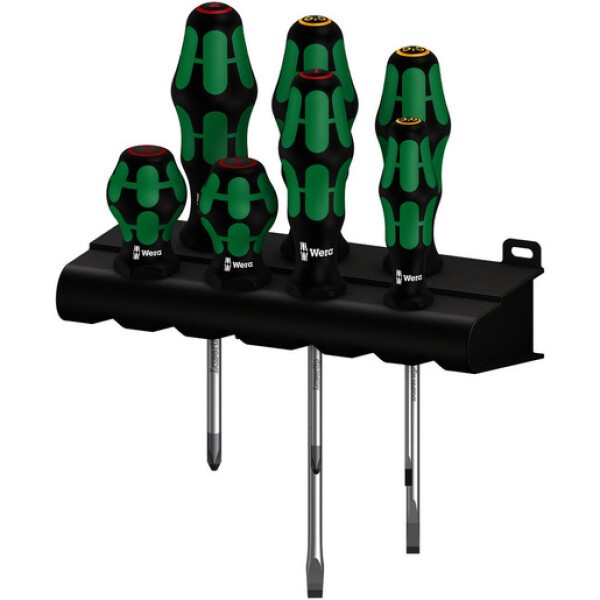 Application-specific mixture of workshop screwdrivers with normal long blade and especially small Stubby screwdrivers with short blade for hard to reach areas. The 2-component Kraftform handle with its practical combination of hard and soft zones allows for a firm grip and precise working. The blades have all the benefits of the Wera Bit technology. Special surface treatment of the blades for high corrosion protection and an optimum fit in the screw head. The hexagon anti-roll protection prevents annoying rolling away of bits in the workplace.