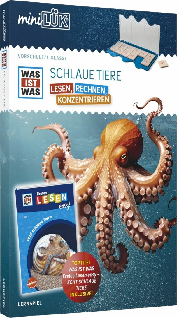 Superschlaue Schulstartübungen mit miniLÜK und WAS IST WAS! Kluge Kraken, verschwatzte Delfine, smarte Raben zeigen, dass wir nicht die einzige intelligente Spezies auf unserem Planeten sind und helfen den Kindern dabei ganz nebenbei, erste Lese- und Rechenschritte zu meistern und im logischen Denken Erfolge zu verbuchen! Im Set enthalten sind: ein blaues miniLÜK-Kontrollgerät das miniLÜK-Übungsheft ''WAS IST WAS -Schlaue Tiere'' das Buch ''WAS IST WAS Erstes Lesen easy! Schlaue Tiere''