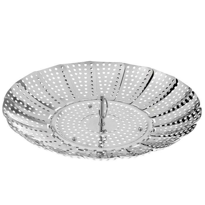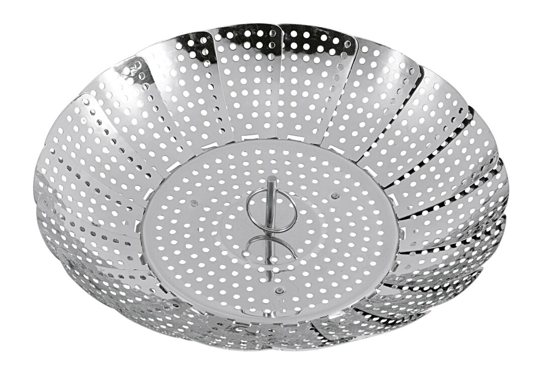 Dünsteinsatz zum Dämpfen, wasserarmen Garen und Blanchieren, für Töpfe von 14 bis 26 cm, beliebig verstellbar. Material: Edelstahl rostfrei.