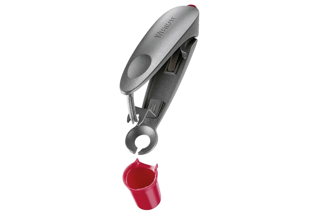Kirschentkerner "Kerni", Aluminium / Kunststoff. Eigenschaften: modernes ergonomisches Design | robuster sternförmiger Entkernstößel | abnehmbarer Auffangbehälter | entkernt Kirschen auch mit Stiel | platzsparend dank Scharniersperre | spülmaschinengeeignet. Maße: (LxBxH): 15,5x3,2x4,3 cm.