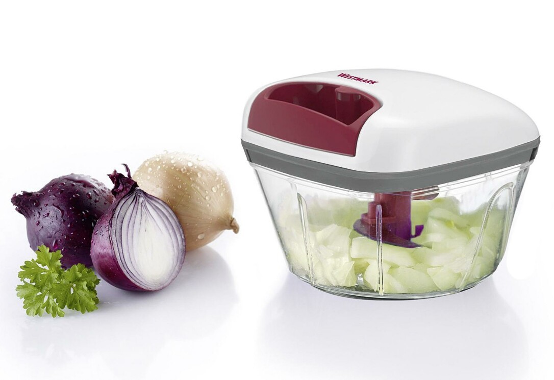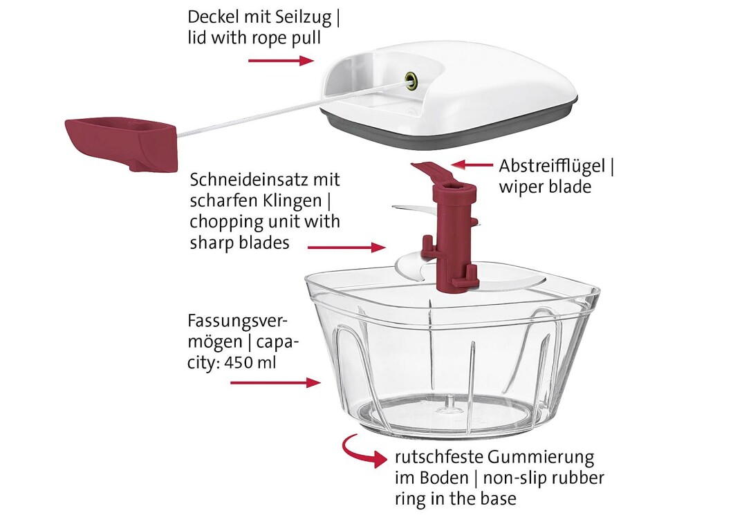 Multi-Schneider mit Seilzug, 450 ml. Einfaches und schnelles Zerkleinern von Obst, Gemüse, Kräutern und Nüssen. Sehr scharfe Klingen und rutschfester Boden. Leicht zu bedienender Seilzug. Nicht spülmaschinengeeignet. Edelstahl, PP, ABS, POM, PS, TPE