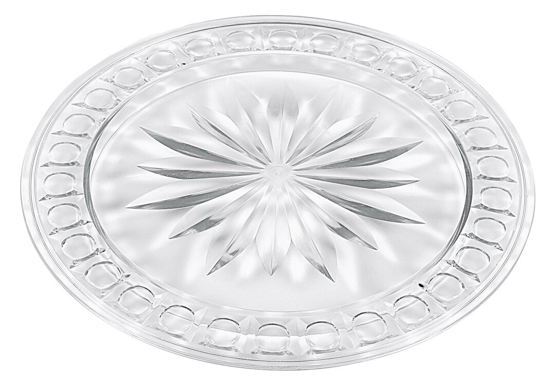 Die Tortenplatte, ø 31 cm, aus Polystyrol sieht aus wie Glas. Sie ist bruchunempfindlich und hat eine glatte Form zum Servieren von Kuchen, Torten, Gebäck, Aufschnitt und Snacks.