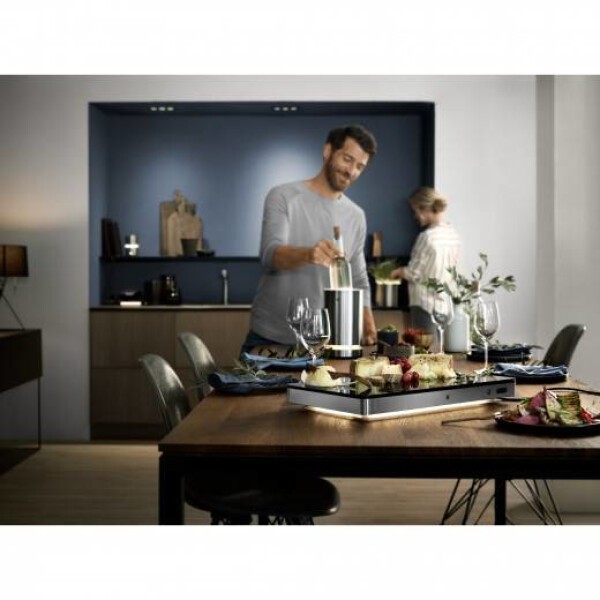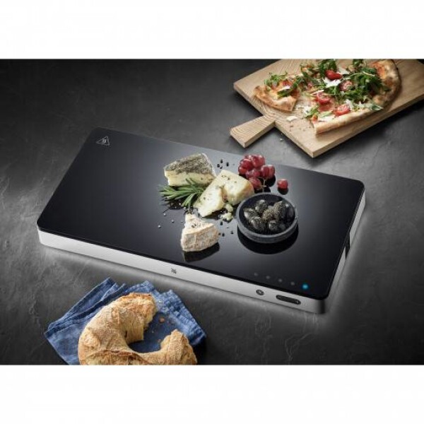 Kühl- und Warmhalteplatte, Ambient, bereichert mit ihrer stilvollen Erscheinung in mattem Cromargan und mit hochwertiger Glasoberfläche jeden Tisch und setzt die darauf warmgehaltenen oder gekühlten Speisen gekonnt in Szene. Ob kleine, warme Köstlichkeiten wie Pizza oder Quiche Lorraine, Suppen oder auch ein Bratentopf: Durch die 4 voreingestellten Temperaturstufen zwischen 50 und 110°C behält jede Speise ihre optimale EssTemperatur. Dank des separaten Kühlelements bleiben aber auch Käse, Obst und Desserts bis zu 2 Stunden frisch und auf optimaler Temperatur. Für ganz besondere Effekte bei Dämmerlicht sorgt dazu das jederzeit frei zuschaltbare WMF Ambient Light, das Speisen sowie die Umgebung in ein ganz besonderes Licht rückt - nach Wahl in 3 Helligkeitsstufen und kinderleicht bedienbar mit WMF Easy Touch Technologie.