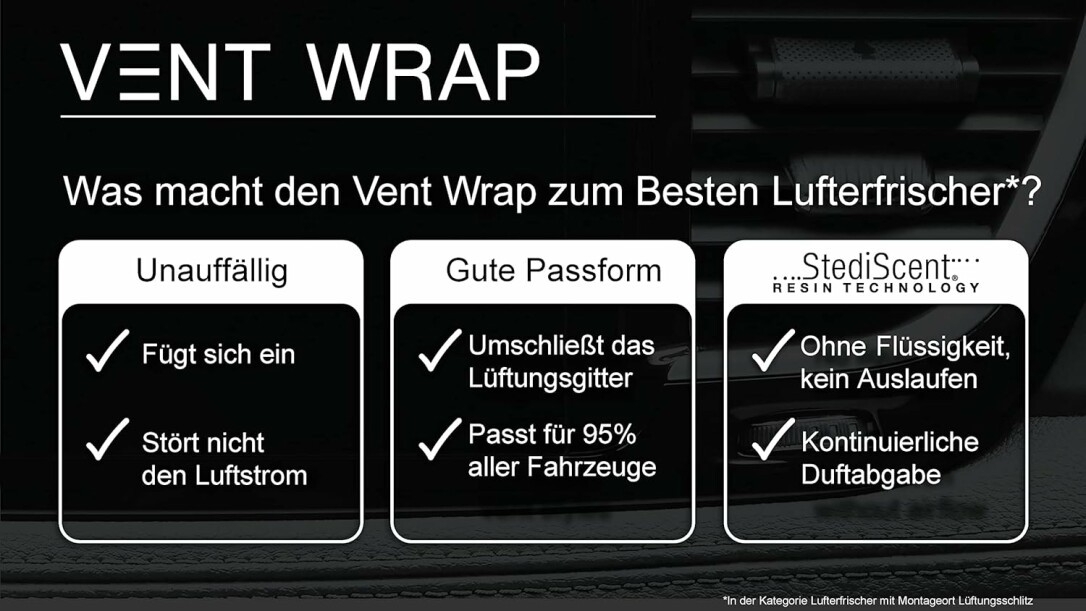 VENT WRAP: Das schlanke Design wird auf die Lüftungslamelle gesteckt, sodass die Luft ungehindert strömen kann und gleichzeitig ein gleichmäßiger, angenehmer Duft abgegeben wird.