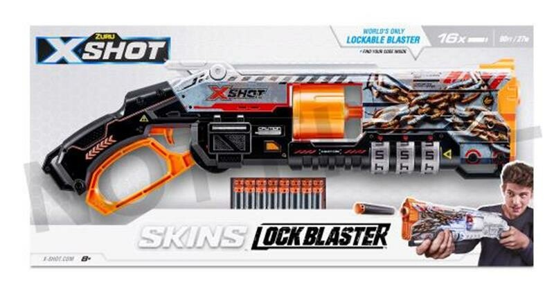 Mit dem XSHOT Skins Lock Blaster hast du die Macht in deinen Händen! Jeder Lock Blaster wird mit einem QR-Code geliefert, mit dem du deine einzigartige Schlosskombination herausfinden kannst. Entriegle deinen Blaster und der Spaß kann beginnen! Der Lock Blaster hat einen rotierenden Lauf mit 8 Darts, der die Darts in Sekundenschnelle abschießt und Ziele in bis zu 27 m Entfernung trifft! Schließe deinen Blaster ab wenn das Battle vorbei ist, sodass niemand sonst ihn benutzen kann. Wähle anders, wähle XSHOT Skins. Für Kinder ab 8 Jahren.